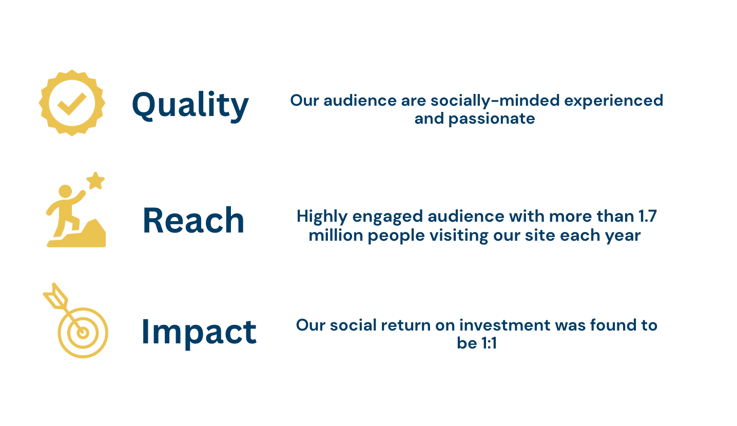 Get in touch to chat through how we can help you have a greater impact or help you reach our audience. We have a whole range of offerings that can be tailored to suit you and your organisation.