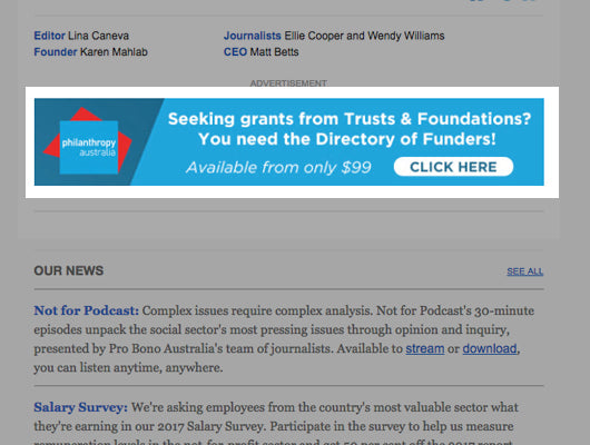 A banner advertisement (580 x 150 px) is included under the editor's note in one of our bi-weekly news services reaching over 27k subscribers.